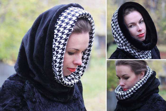 Изменить размер шрифта Шьем шарф — хомут с капюшоном! Его еще принято называть шарф-капор, снуд. Такой шарф с капюшоном — прекрасная альтернатива шапкам, платкам и другими головным уборам. Для ранней весны то, что надо, вместе с пальто. Солнышко пригрело — скидываем капюшон, ветерок подул — надели обратно. Шарф-хомут представляет собой сшитый по кругу шарф — трансформер. Чтобы сшить такой модный и удобный шарф-хомут с капюшоном понадобится очень простая выкройка. Отметим, что в настоящее время любительницам изготовить уникальный предмет гардероба своими руками будет полезно ознакомиться с различными видеоуроками шитья от профессиональных закройщиков и портных, таких, как Ирина Паукште и другие. Посмотрите еще, как по разному смотрятся шарфы-хомуты с капюшонами из различных материалов: Шарф можно сшить из теплой или легкой ткани, в зависимости от того в каком сезоне вы собираетесь его носить. Начертите выкройку на листе бумаги или на картоне, исходя из размера головы и желаемой длины шарфа. Длина шарфа должна обеспечивать двухразовое свободное обматывание вокруг шеи. Прибавьте припуски на швы и свободное облегание. Выкройте четыре одинаковых детали по две детали каждого цвета. Сшейте детали только по задней части капюшона. Обработайте швы строчкой зигзаг или оверлоком.
