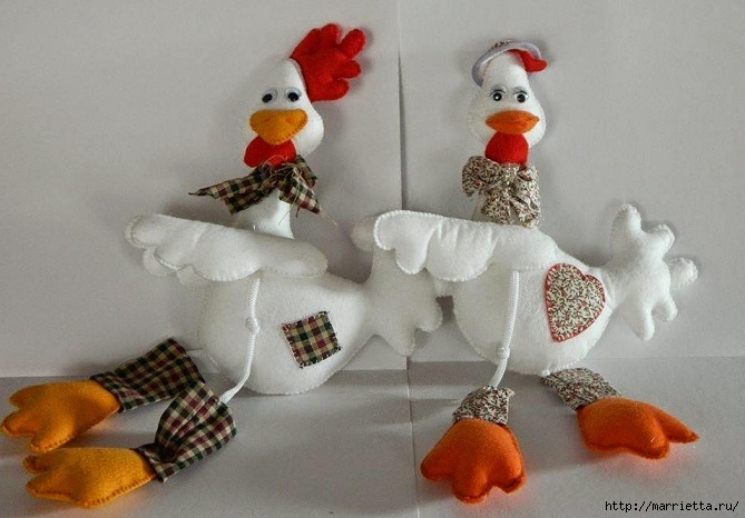 Можно сделать крылья подвижными. Для этого их нужно пристегнуть на подходящие по цвету и размеру пуговицы. Так могут быть сделаны различные петушки из ткани своими руками.