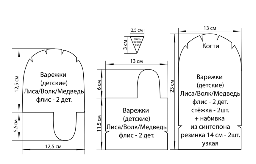 Выкройка варежек из меха ничем не отличается от описанного выше построения флисовой рукавички. Тут такие же припуски для швов, да и этапы сборки схожи.