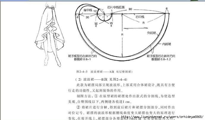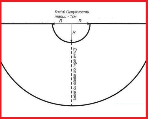 Ещё один вариант асимметричного кроя показан на следующем чертеже. Такая юбка может выполняться как с посадкой на талии, так и с посадкой на бёдрах. В первом случае для определения меньшего радиуса используем замер ОТ, во втором – ОБ.