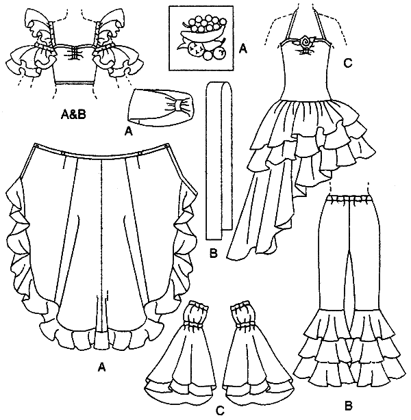 Юбочки с воланами подчёркивают женственность, чувственность. Ряды воланов начинаются на бёдрах. Аналогично бахроме воланы увеличивают амплитуду движений корпусом. Такие модели рекомендуют выбирать девушкам со стройными коленями. Если есть излишняя полнота ног до середины бедра – не страшно, воланы скроют её. Для очень худеньких девушек наряды с воланами не стоит шить, они только подчеркнут худобу.